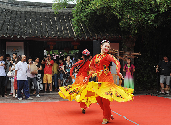 库车县民间艺术团演员苏比努尔向宁波市民展示曼妙舞姿