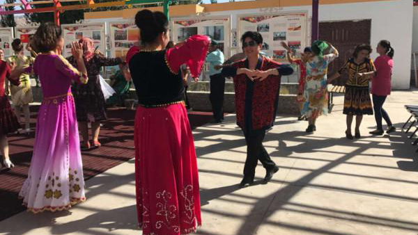 走进康村,村民们正在举行活动,载歌载舞。在康村的文化大礼堂,记者见到了宁波市政协原副主席傅丹。作为国家一级的琵琶演奏艺术家,本次傅丹主席来到传说中的琵琶起源地进行采风。图为傅丹主席正在和村民一起跳舞。