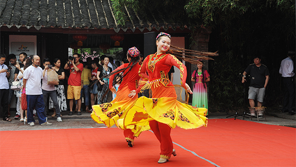 库车县民间艺术团演员苏比努尔向宁波市民展示曼妙舞姿。